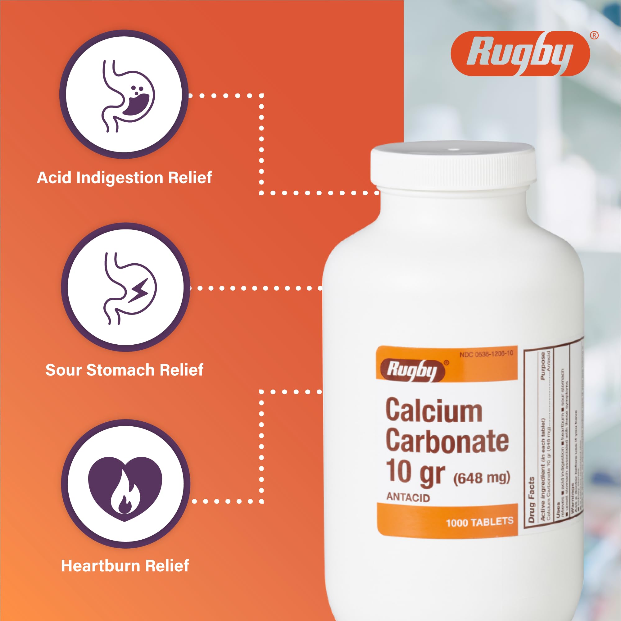 ANTACID: Rugby Calcium Carbonate 10 gr relieves acid indigestion, heartburn, sour stomach, and upset stomach associated with these symptoms.
