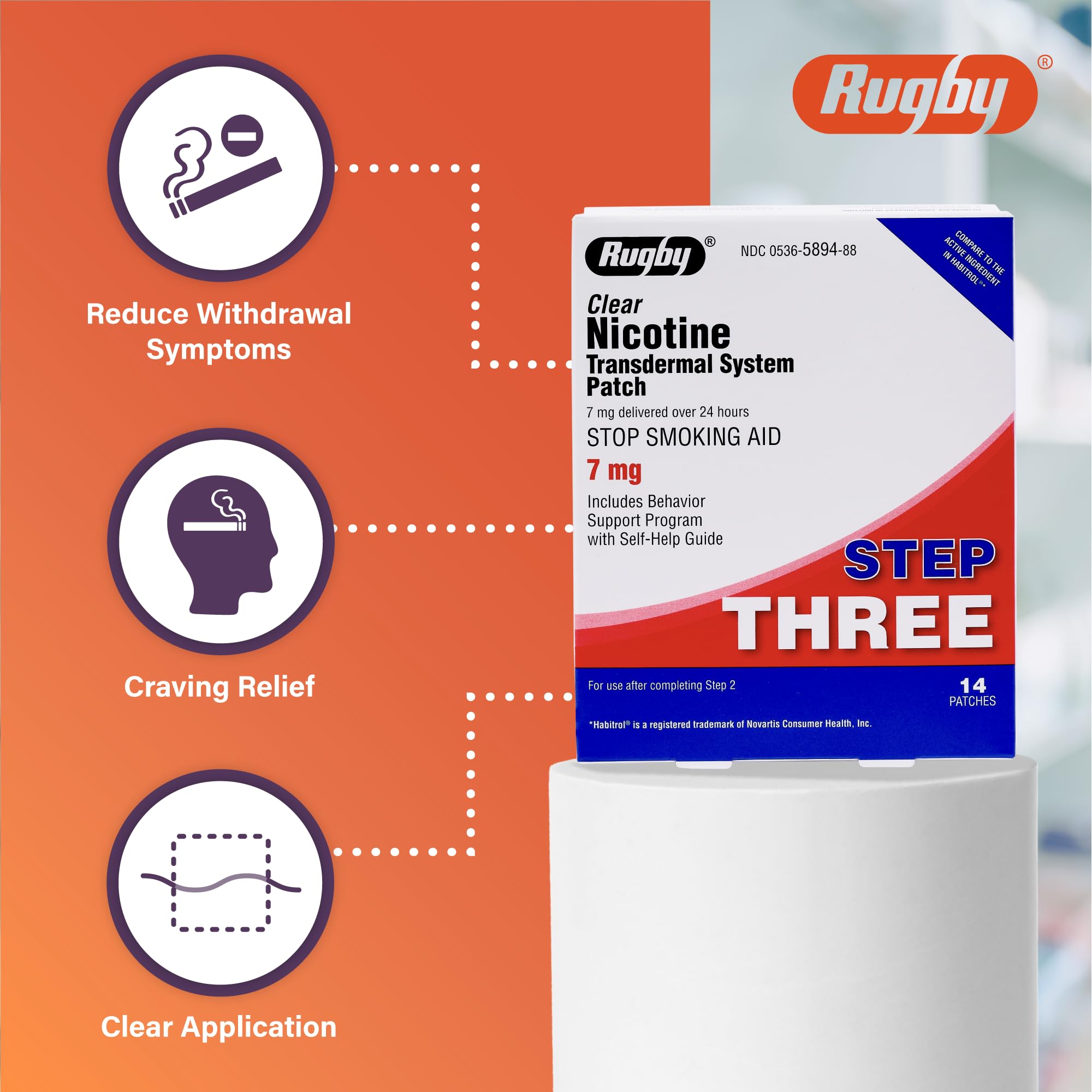 Rugby Clear Nicotine Patches - 7mg Transdermal System Patch - Smoking or Vaping Quitting Aid - Step 3 - (1 Pack)—