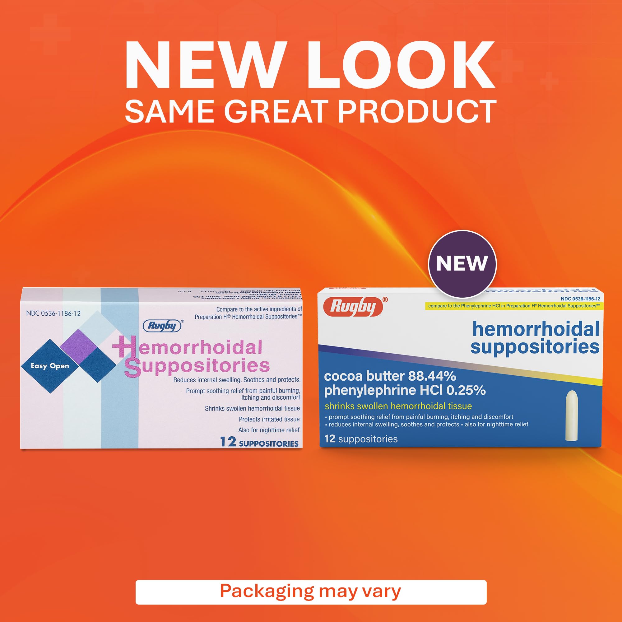 Rugby Hemorrhoidal Suppositories - Soothing and Shrinking Action for Internal Hemorrhoids with Cocoa Butter and Phenylephrine HCl, Easy Open Design - 12 Count—