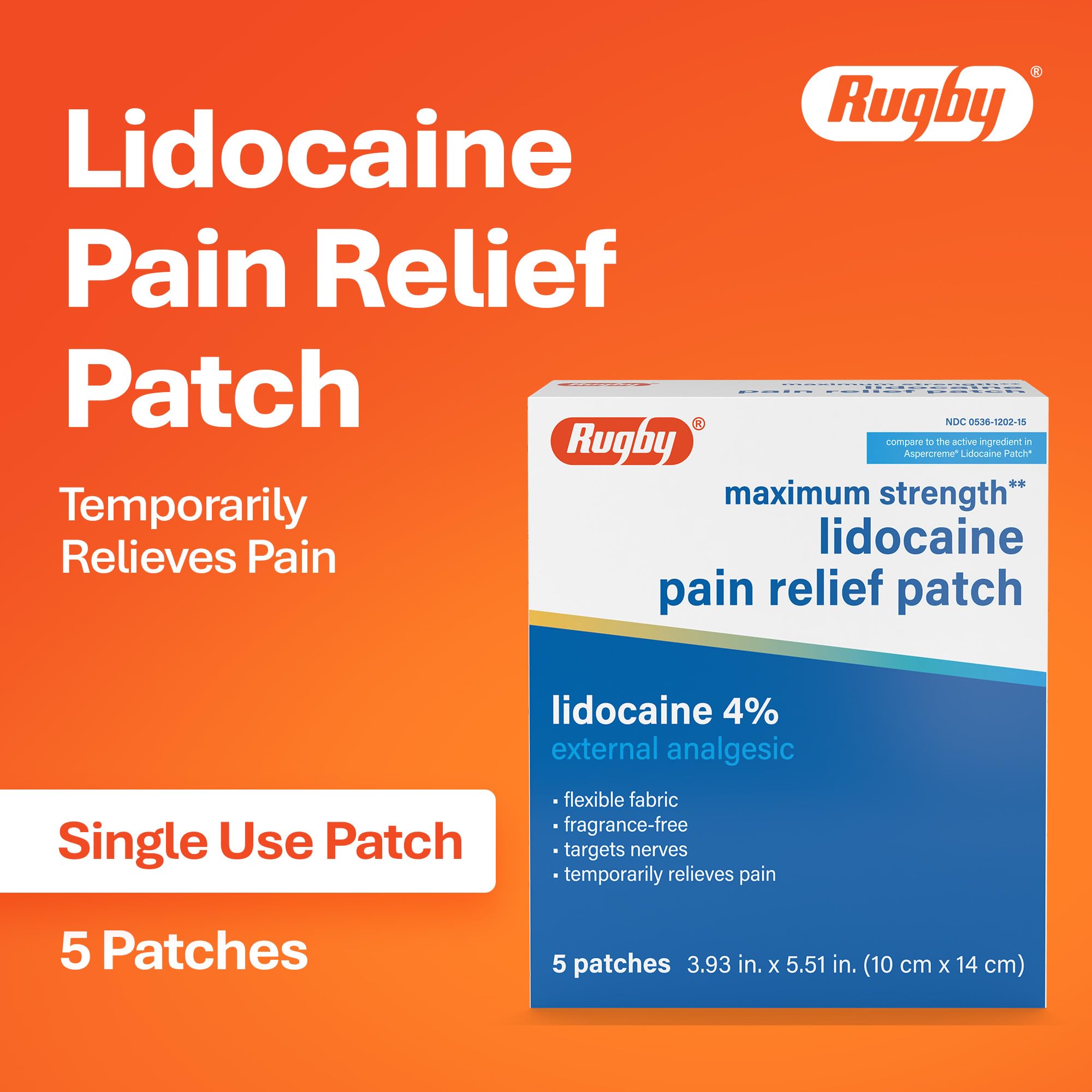 Rugby Maximum Strength 4% Lidocaine Pain Relief Patch - Topical Anesthetic Patches, Flexible, Odor Free, Single Use - 5 Count