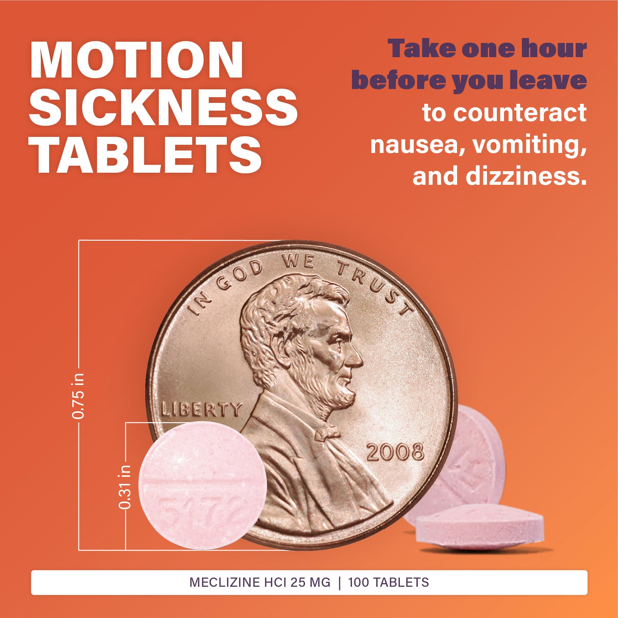 - TRAVEL SICKNESS TABLETS: Whether you are traveling by sea, air, or land, these chewable 25 mg meclizine HCl tablets help provide relief. Take one hour before you leave to experience the effects in time.