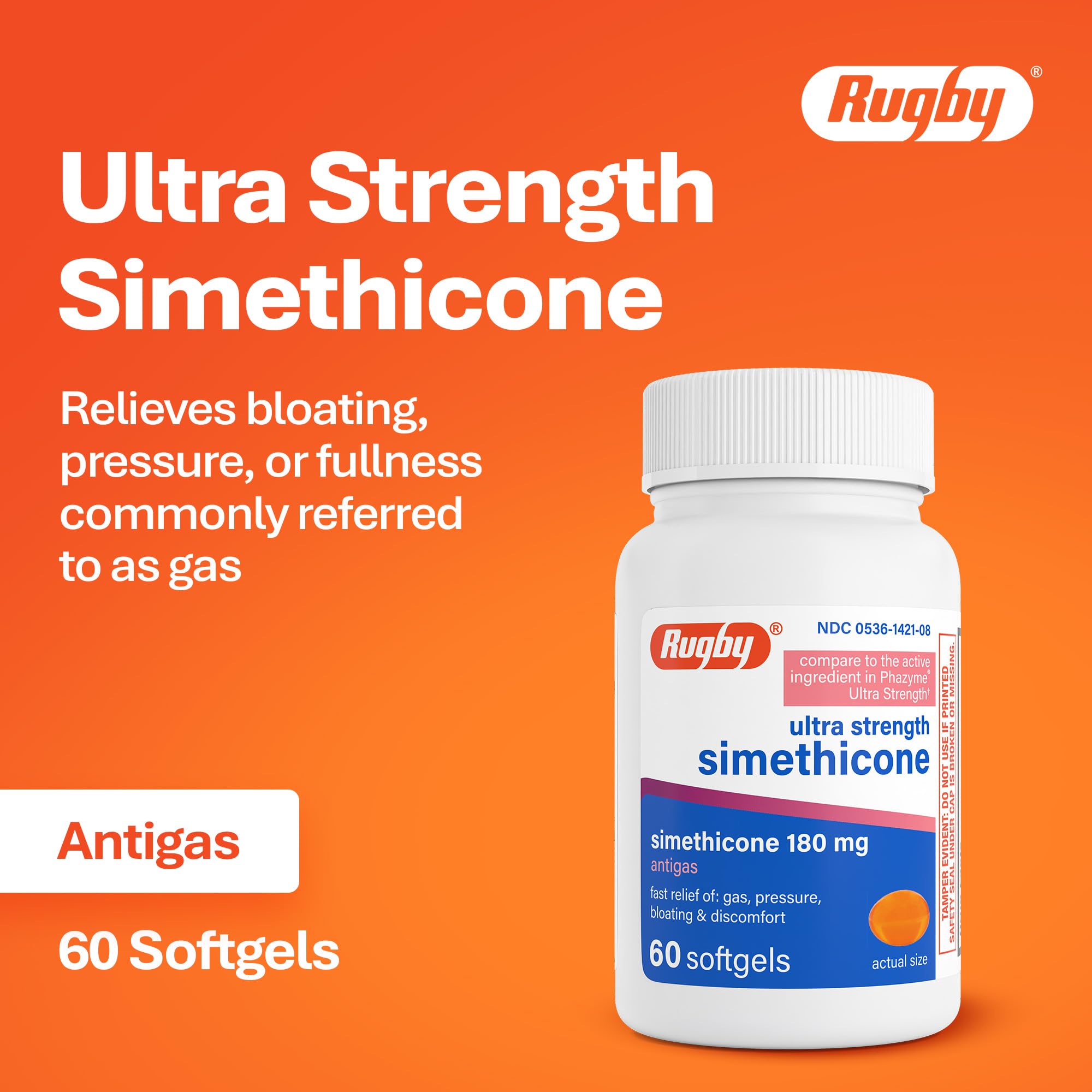 - GAS RELIEF FOR ADULTS: The Rugby Ultra Strength Simethicone Gas Relief pills are a trusted remedy that may help reduce symptoms associated with stomach gas discomfort. These softgel gas pills may help support relief of flatulence, bloating, and fullness.